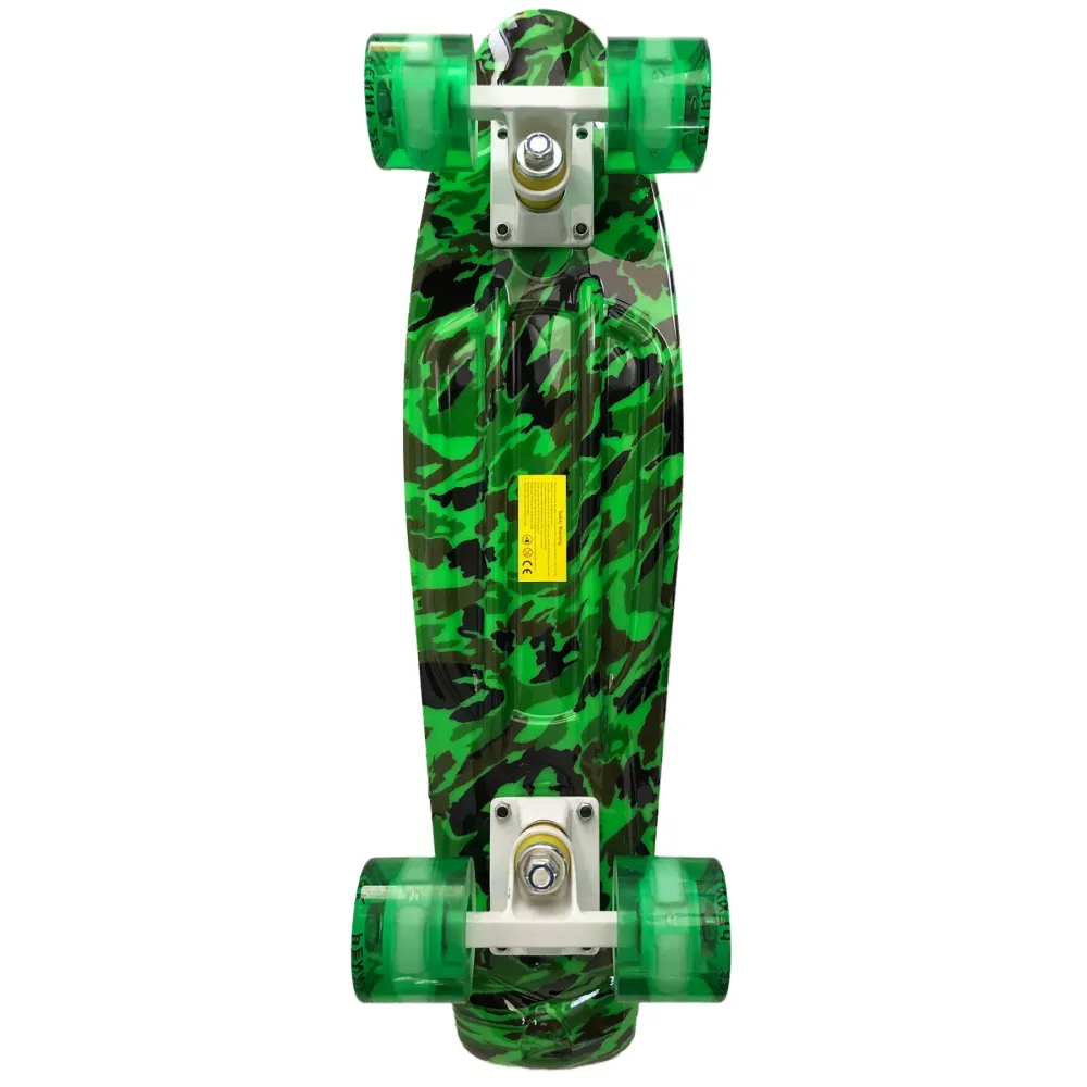 Пенни Борд Zippy ULTRA 22" Камуфляж - новая серия пенни борд с принтами и со светящимися колесами – это сочетание ярких, тематических рисунков и эффектных светящихся колес, а также улучшенного и доработанного качества, плавности хода. Принт с двух сторон доски.