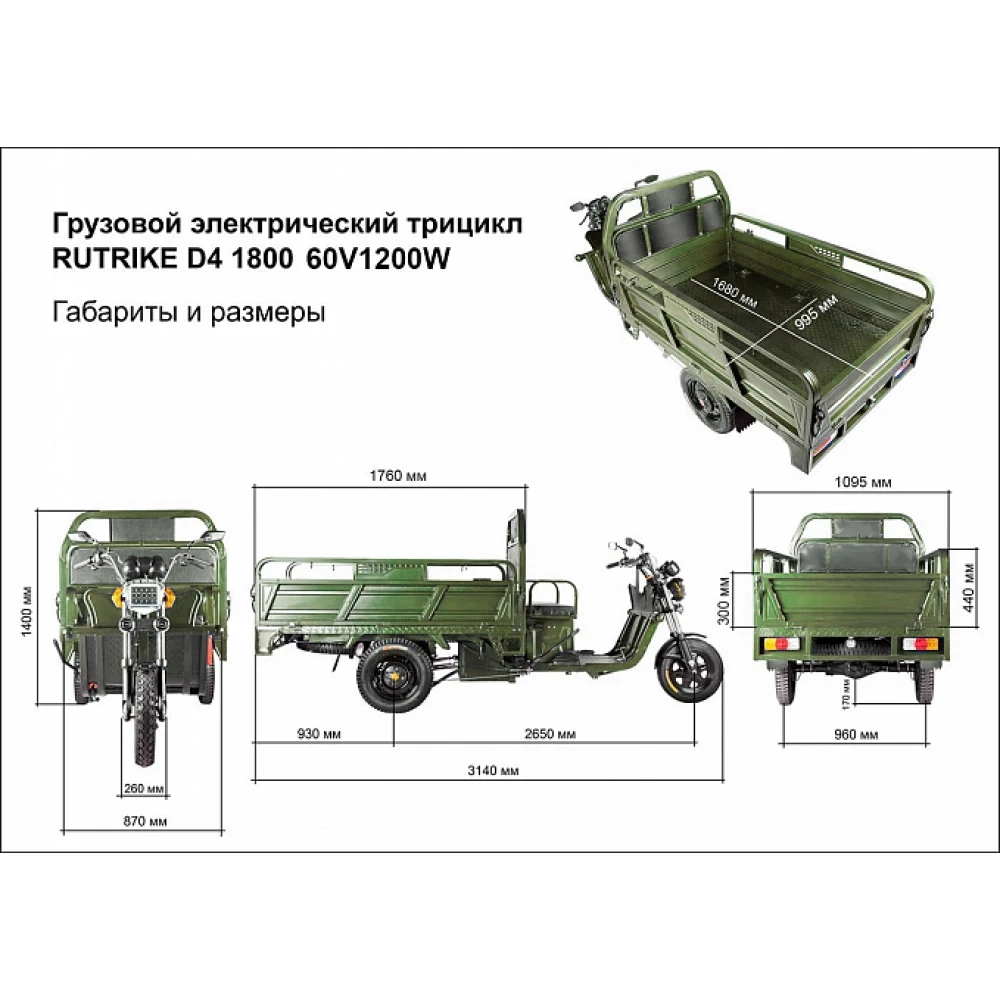 Грузовой электротрицикл Rutrike D4 1800 60V1200W зеленый – выглядит современно и круто. Модель предназначена для представителей коммерции и частного сектора. Наличие вместительно кузова позволяет перевозить до 10 пассажиров одновременно, использовать пространство для транспортировки груза массой до 1т.